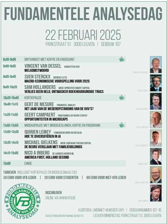Op zaterdag 22 februari 2025 organiseerde VFB de Fundamentele Analysedag, een unieke kans voor beleggers, studenten en financiële experts om inzichten te verkrijgen in macro-economische vooruitzichten, sectoranalyses en aandelenstrategieën. Deze dag bood een boeiende line-up van topsprekers, waardevolle kennis en netwerkmogelijkheden.