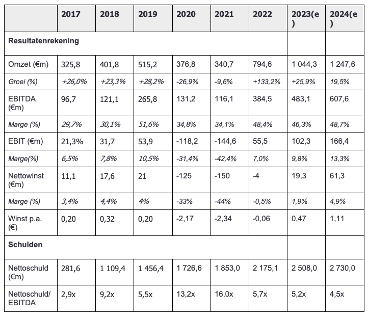 Een deel van deze financiële lasten - zo’n 300 miljoen euro - werd in 2021 opgehaald via een converteerbare obligatie. Over verwatering door omzetting naar aandelen moet u zich als belegger niet te veel zorgen maken, daar de conversieprijs van 50,625 euro ver boven de huidige koers ligt.