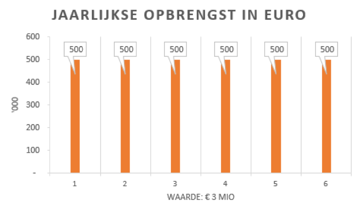Goed, laten we de opbrengsten dan verdisconteren, ofwel terugrekenen met 3 procent. Dan is de kip vandaag 2,29 miljoen euro waard. De eieren leveren je dan 3 procent per jaar op, net als het spaarboekje.