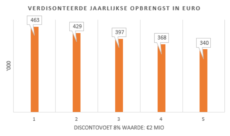 Je loopt dus risico dat je op het spaarboekje niet loopt en daarvoor wil je als investeerder vergoed worden. Tegen 3 procent verwacht rendement heb je geen enkele plausibele reden om je geld te verplaatsen van je spaarrekening naar de kip. Je hebt een punt. Wat denk je ervan dat we de verwachte opbrengst terugrekenen met 8 procent? Je mag er dan maximaal 2 miljoen euro voor betalen.