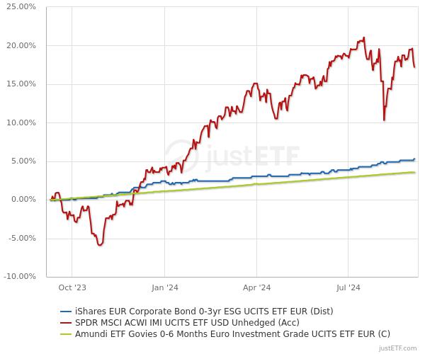 Gezapig ging deze ‘geld’- ETF, die enkel belegt in korte looptijden tot 6 maanden, op één jaar tijd 3,63% hoger. Hier moet 30% roerende voorheffing af bij verkoop, want het is een kapitaliserende ETF. Het ideale aan beleggen in zo’n verzameling van korte overheidsleningen is het gemak waarmee u de lage rentes bij de bank passeert en rechtstreeks geld kan lenen aan de staat. Let op, nu de Europese Centrale Bank de rente aan het verlagen is, zakt ook de rentevoet bij de overheid. Deze ETF is een alternatief voor uw spaarrekening zonder afhankelijkheid van getrouwheidspremies. (FR0010754200)