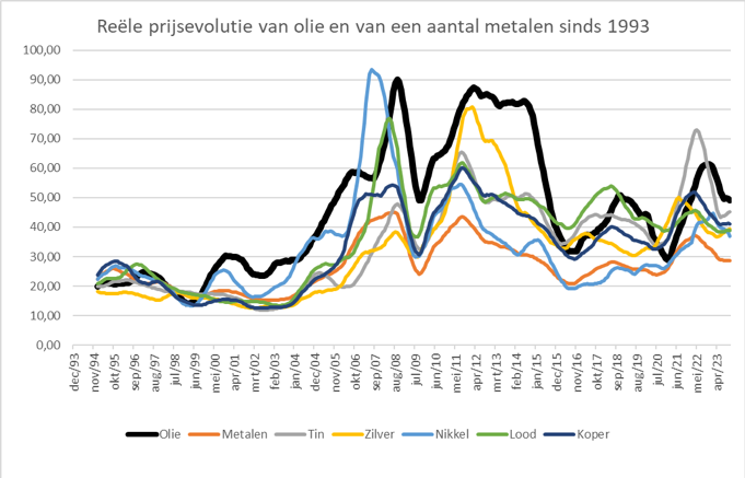 Om die twee vragen te beantwoorden, heb ik een grafiek voorbereid met de reële prijsevolutie van een aantal metalen tussen 1993 en 2023 op basis van gegevens van IndexMundi (zie grafiek 3). Om het wat te laten aansluiten bij de eerste grafiek heb ik de startwaarde van de olieprijs gelijkgezet aan de eindwaarde van de reële index in de vorige grafiek, namelijk 20.