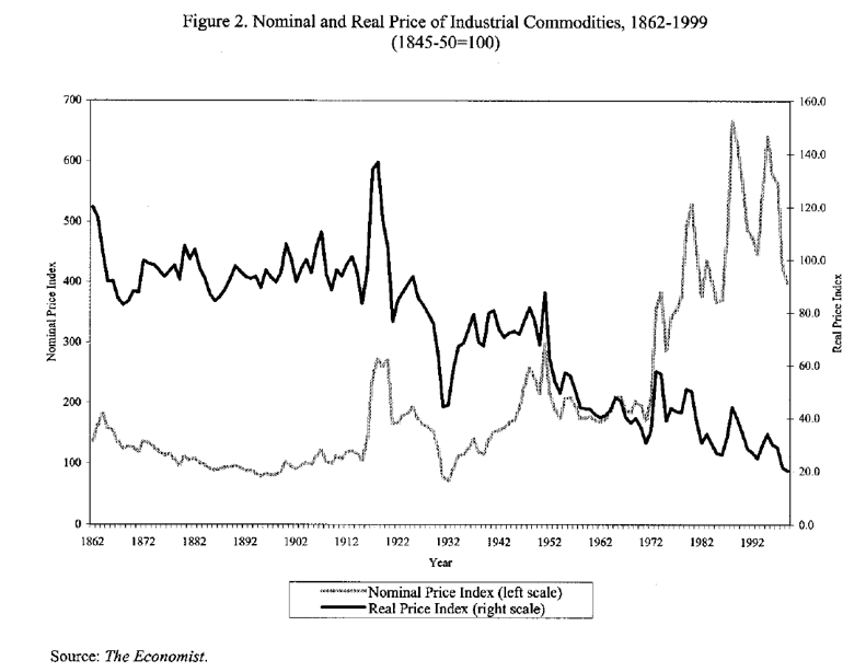 Kijk naar de donkere lijn. Die geeft de reële prijsevolutie weer van een index van industriële grondstoffenprijzen tussen 1862 en 1999. Dat wil zeggen, gecorrigeerd voor inflatie. Wanneer je naar de rechteras kijkt, dan zie je dat de waarde daalde van ongeveer 120 in 1862 naar ongeveer 20 in 1999.