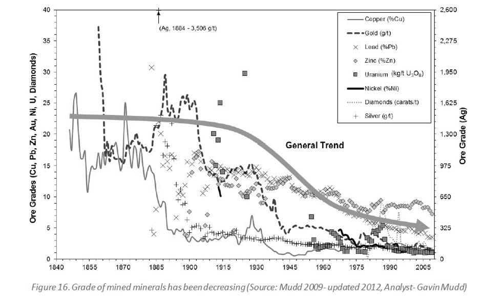 Men is inderdaad begonnen met de rijkste aders. Het ertsgehalte van ontgonnen grondstoffen daalt jaar na jaar. In 1840 waren er nog koperaders met meer dan 20 procent koper. Tegenwoordig is dat vaak 1 procent of minder.