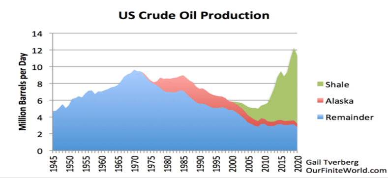 Dat blijkt uit grafiek 5. Het tijdperk van de goedkope conventionele olie is op veel plaatsen stilaan gedaan. Maar ook bij het tijdperk van de duurdere schalieolie zijn vraagtekens te zetten. Geoloog Arthur Berman wijst erop dat men ook daar begonnen is met de makkelijkst bereikbare en dat het er niet goed uitziet. De Amerikanen zijn hun schalie-olie aan het opslurpen en het glas is bijna leeg. We moeten steeds meer energie steken in de productie van energie.
