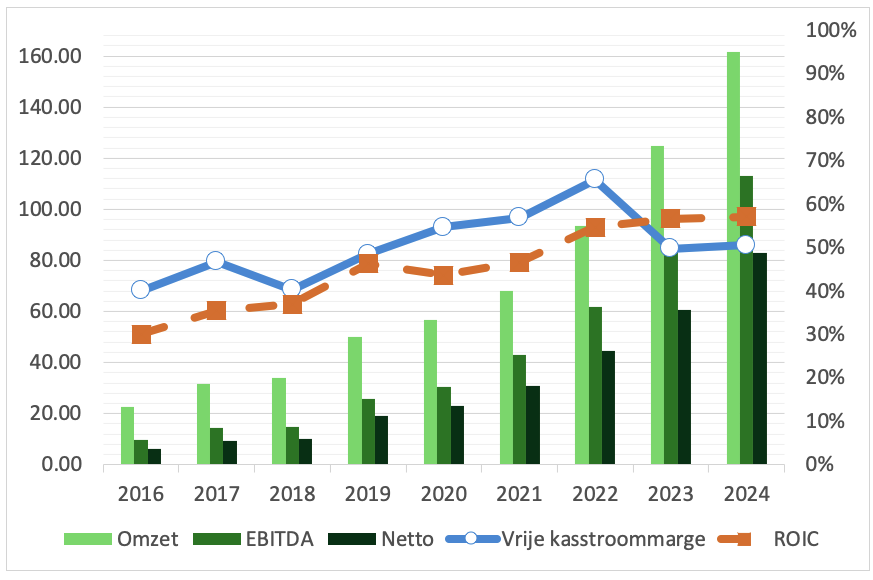 De financiële prestaties, die in de bijgevoegde grafiek worden afgebeeld, spreken boekdelen. Sinds 2016 is de omzet gestegen van 22,5 naar 161,5 miljoen AUD (Australische dollar). De nettowinst steeg in dezelfde periode van 6,4 naar 82,8 miljoen AUD. De vrije kasstroommarge verbeterde van 40% naar meer dan 50%, terwijl het rendement op geïnvesteerd kapitaal (ROIC) opliep van 30% naar ruim 57%. Jaar na jaar wist Pro Medicus zijn marges te verbeteren: in 2024 bedroeg de EBITDA-marge maar liefst 70%. Deze cijfers illustreren niet alleen de operationele efficiëntie, maar ook het duurzame concurrentievoordeel van het platform.