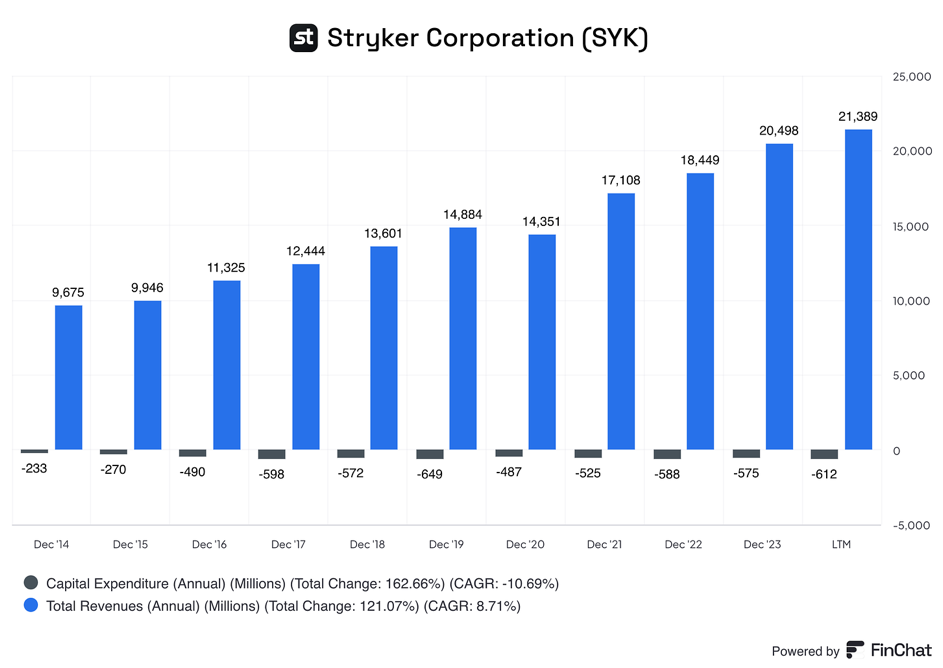 Stryker ontwerpt, produceert en verkoopt medische apparatuur, instrumenten, verbruiksartikelen en implanteerbare apparaten (zie grafiek 2). Het productportfolio omvat heup- en knievervangingen, endoscopiesystemen, apparatuur voor operatiekamers, emboliespiralen, ziekenhuisbedden en -brancards en wervelkolomapparaten. Stryker is een van de drie grote concurrenten in reconstructieve orthopedische implantaten en is een marktleider in operatiekamerapparatuur.
