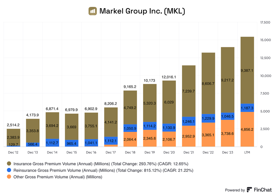 Markel kan worden gezien als een ‘mini-Berkshire Hathaway’. Het opereert als een gediversifieerd financieel holdingbedrijf met een bedrijfsmodel dat gericht is op verzekeringen, herverzekeringen en investeringen (Zie grafiek 3) Markel heeft verzekeringsproducten voor verschillende industrieën en klanten wereldwijd. De strategie van het bedrijf omvat het onderschrijven van verzekeringspolissen, effectief risicobeheer en het investeren van zijn kapitaal in een portfolio van bedrijven en effecten.