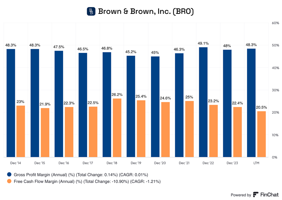 Grafiek 4: De bruto winstmarge en free cashflowmarge van Brown & Brown
