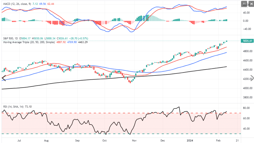 Op vrijdag 9 februari brak de markt uiteindelijk door de 5000 punten. De dag ervoor sloot de markt op 4997,91 en kon niet boven dat niveau uitkomen. Dit is echter niet verrassend, aangezien de markt op veel technische niveaus nog steeds overbought is. Interessant genoeg beginnen we enige rotatie te zien. De dag ervoor bleven de recente leiders achter, terwijl de sector energie (XLE) en basis consumptiegoederen (XLP) het beter deden. De markt blijft vrij onregelmatig, waarbij de bewegingen grotendeels nog steeds in relatie staan met de winstrapporten.