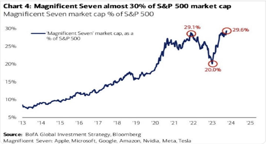 Marktkapitalisatie evolutie vanaf 2013 van de momenteel 7 grootste VS aandelen, omvat nu +/- 30% van de S&P500