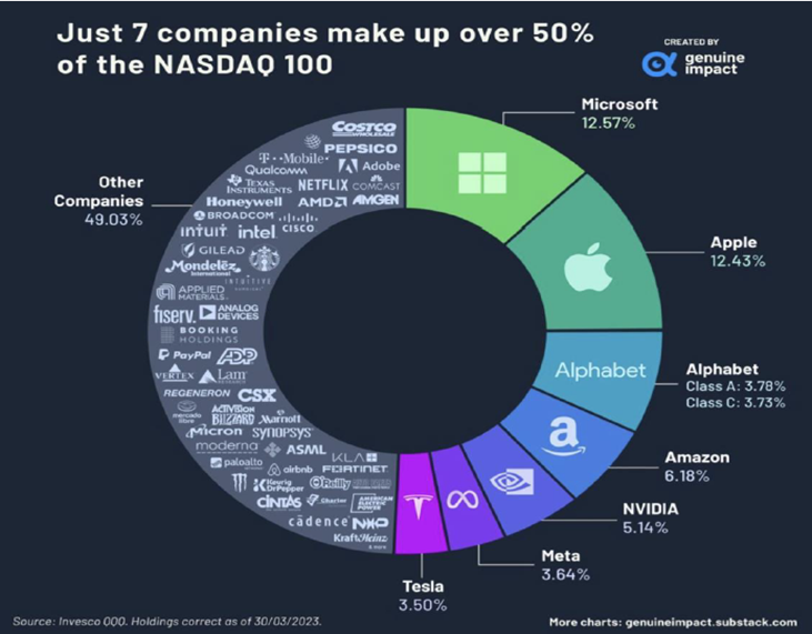 Samenstelling Nasdaq 100 index, grootste 7 vertegenwoordigen momenteel iets meer dan 50%