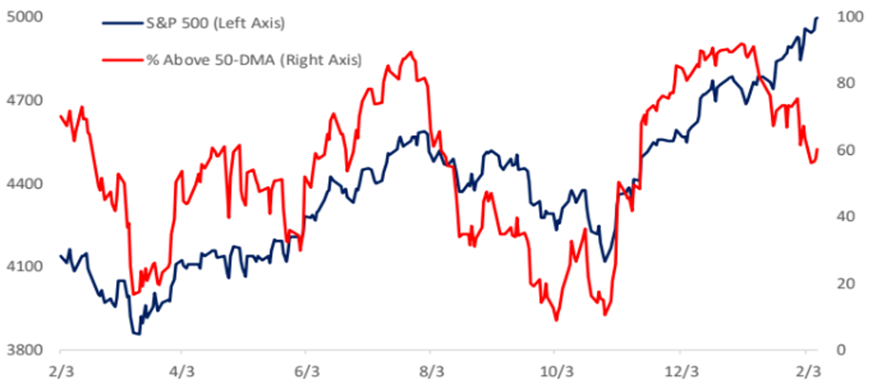 Het percentage van de aandelen in de index die boven hun 50-daags gemiddelde (50-DMA) neemt af, zie rode curve in onderstaande grafiek. Donderdag 8 februari sloot de S&P500 op een nieuwe recordhoogte, maar slechts 60% van de componenten stonden boven hun 50-DMA, en eerder in de week was dit percentage gedaald tot 56%.
