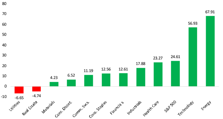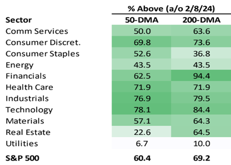 Ten opzichte van het 200-DMA ziet de breedte er positiever en uniformer uit omdat bijna 70% van de aandelen in de S&P500 boven dat niveau ligt. Op sectorniveau zijn de sectoren Consumer Staples of basisverbruiksgoederen genaamd (XLP), Energy (XLE) en Utilities (XLU) de enige sectoren met minder dan 60% van hun componenten boven hun 200-DMA's.
