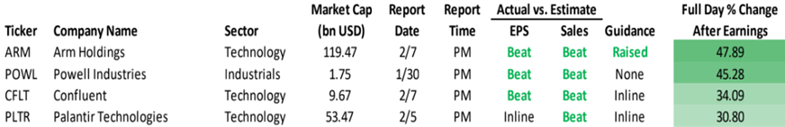 In de tabel hieronder kan je de aandelen zien die tot nu toe in 2024 de grootste rally's hebben doorgemaakt in reactie op de winstcijfers. Zoals te zien is, resulteerde de halfgeleiderontwerper Arm Holdings (ARM) in een verbazingwekkende rally van 47,9%. Dat overtrof de winst van 45,3% van Powell Industries (POWL) na hun rapport van eind januari.