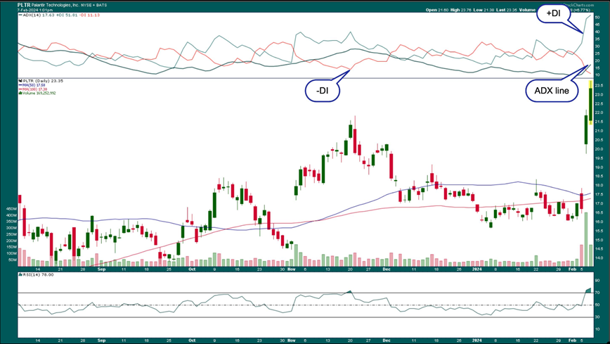 De PLTR-aandelen gingen omhoog na de indrukwekkende winstcijfers in het vierde kwartaal. Om het momentum van de opwaartse trend te volgen kijk je best naar de Average Directional index indicator (ADX genaamd), en de relatieve sterkte-index (RSI), verder meer daarover.