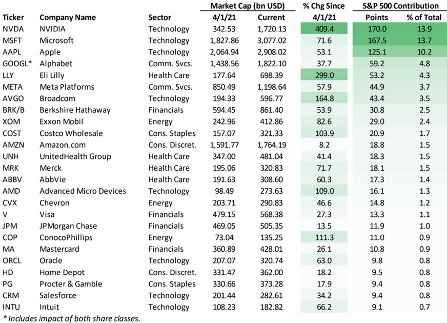 De NVDA rally van meer dan 400% plaatst het aandeel niet alleen op de eerste plaats van de best presterende aandelen in de S&P500 sinds 01/04/21, maar het is ook het aandeel met de grootste positieve impact op de index, alleen al goed voor 13,9% van de beweging. Nvidia (NVDA), Microsoft (MSFT) en Apple (AAPL) alleen al zijn goed voor meer dan een derde van de winst van de S&P500 sinds deze voor het eerst boven de 4000 punten uitkwam.