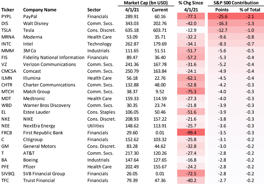 S&P500 grootste negatieve marktkapitalisatie bijdragers sinds het 4000 punten niveau op 01/04/2021