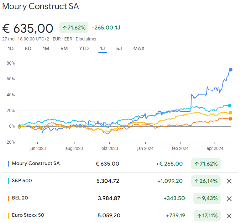 Moury construct SA is al geruime tijd een vaste waarde in mijn portefeuille. Als kleine belegger is het vaak onze ambitie om beter te doen dan de indexen. Als één van de weinig aandelen op de Brusselse beurs slaagt dit bescheiden Waals bouwconcern er wonderwel in deze ambitie waar te maken.