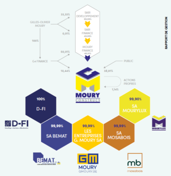 CEO Gilles-Olivier Moury, nummer 360 der rijkste Belgen, bezit ongeveer 60% van alle aandelen via Moury finance (50%) en G4 Finance (10%). Enkel over die laatste kon ik een jaarrekening terug vinden (tot 2022), waar toch wel wat vraagtekens bij te plaatsen zijn. Zelf zegt hij voor 40% aandeelhouder te zijn, met de overige 20% verdeeld over andere familieleden. 16,2% van de aandelen is in handen van 2 institutionele beleggers.