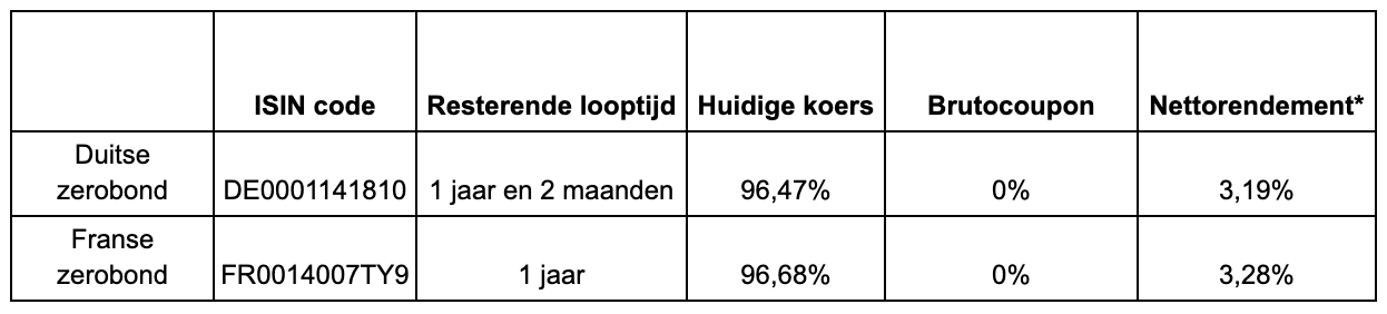In de onderstaande tabel worden twee voorbeelden gegeven van dit soort zerobonds of nulcouponobligaties. Die brengen tot wel 50% meer op dan de Belgische staatsbon op één jaar.