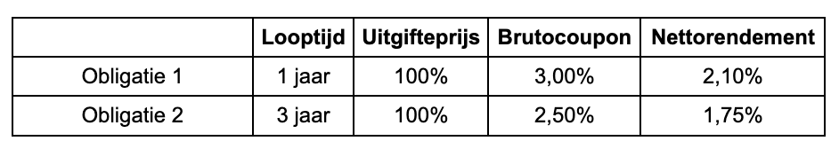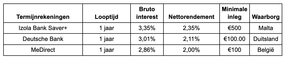 In de onderstaande tabel worden drie voorbeelden gegeven van termijnrekeningen op één jaar, met een vergelijkbaar nettorendement als de Belgische staatsbon op één jaar.