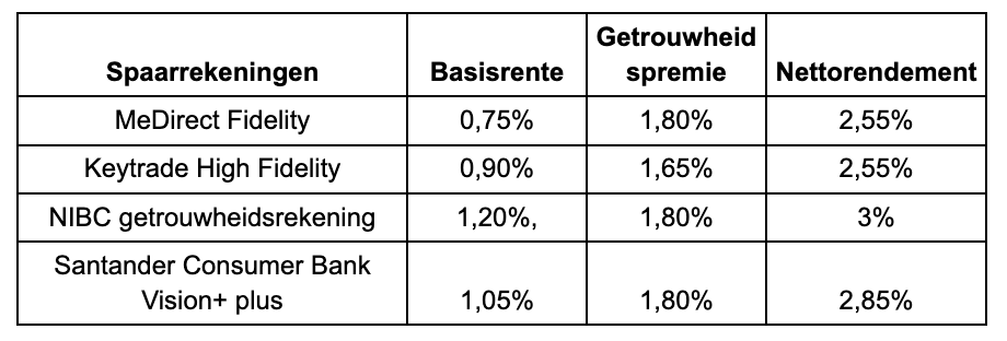 De onderstaande tabel geeft vier voorbeelden van hoogrentende spaarrekeningen.