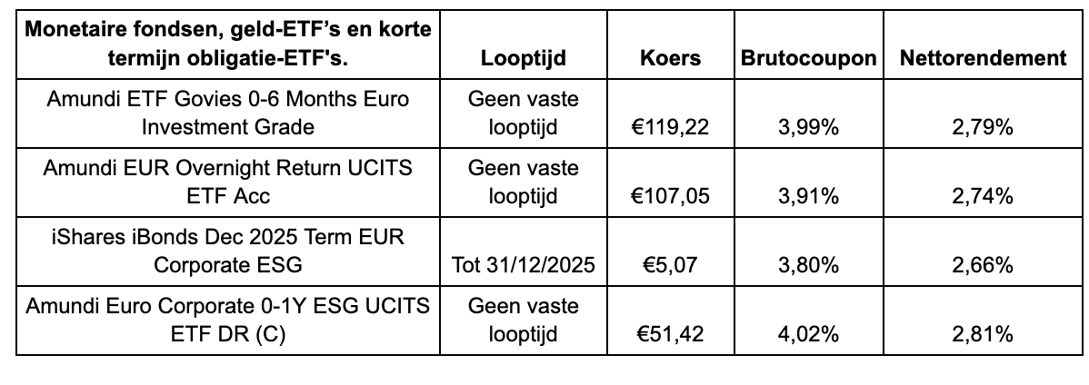 De onderstaande tabel toont interessante monetaire fondsen, geld-ETF’s en korte termijn obligatie-ETF's.