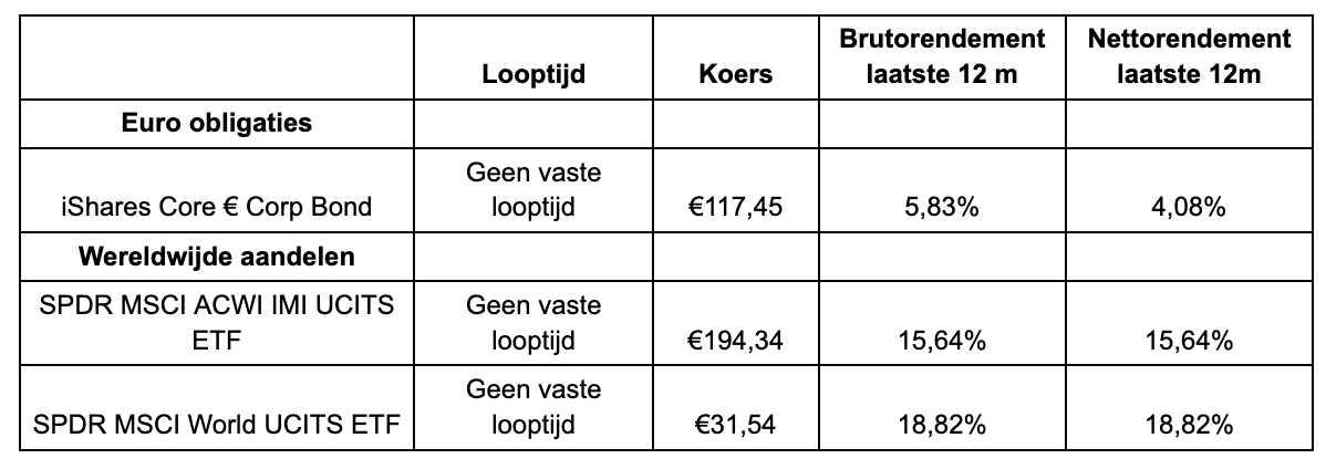 Zowel voor obligaties als voor aandelen bestaan er vandaag goedkope beleggingen, die eenvoudig te kopen zijn en amper opvolging vergen. We hebben het uiteraard over ETF’s (Exchange Traded Funds). Deze producten kopiëren een gespreide index, oftewel een mandje aan beleggingen zoals aandelen. In de onderstaande tabel wordt één voorbeeld gegeven van een obligatie-ETF en twee voorbeelden van aandelen-ETF’s.