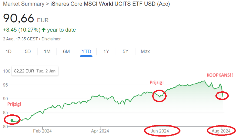 Paniek op fora, in Facebook-groepen en op X (Twitter) na de daling van de MSCI World (IWDA) op vrijdag 2 augustus 2024 met liefst 4 procent. Kopen of nog even wachten was de hamvraag die steeds terugkeerde, en velen trokken zich het weekend dat volgde terug om zich te beraden en voor te bereiden. Sommigen wachtten liever nog een paar extra procentpunten om toe te slaan, maar er leken toch ook heel wat beleggers het erover eens te zijn dat deze unieke kans zo snel mogelijk verzilverd moest worden. Een daling van 4% op indexniveau is immers niet alledaags, zo werd gezegd.