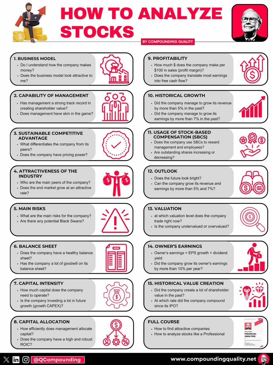 De beste beleggers ter wereld gebruiken een strikt en rationeel kader om bedrijven onder de loep te nemen. Ik gebruik altijd dezelfde vijftien stappen om een aandeel te bekijken. Laten we ze stap voor stap overlopen.