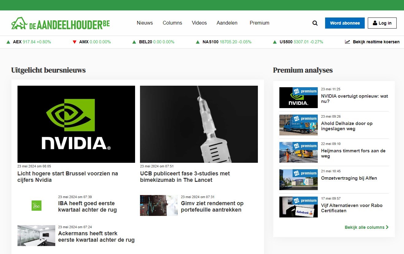 Op de website DeAandeelhouder.nl en DeAandeelhouder.be schrijven ervaren beleggers analyses over aandelen, obligaties en macro nieuws. Het platform maakt onderscheid tussen beursnieuws, koersen en analyses. De Aandeelhouder bied premium analyses in abonnementsvorm aan. Hiermee helpt het beleggers om betere beslissingen te maken over hun beleggingen. Onderdeel van het abonnement betreft een wekelijkse live vragensessie voor haar leden. De leden krijgen in deze videosessie via YouTube direct antwoord op hun vragen.