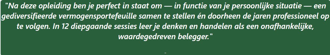 Na afloop beschik je over de kennis en de denkkaders om je portefeuille zelfstandig op te volgen, te evalueren en bij te sturen — met overtuiging, visie en gemoedsrust.
