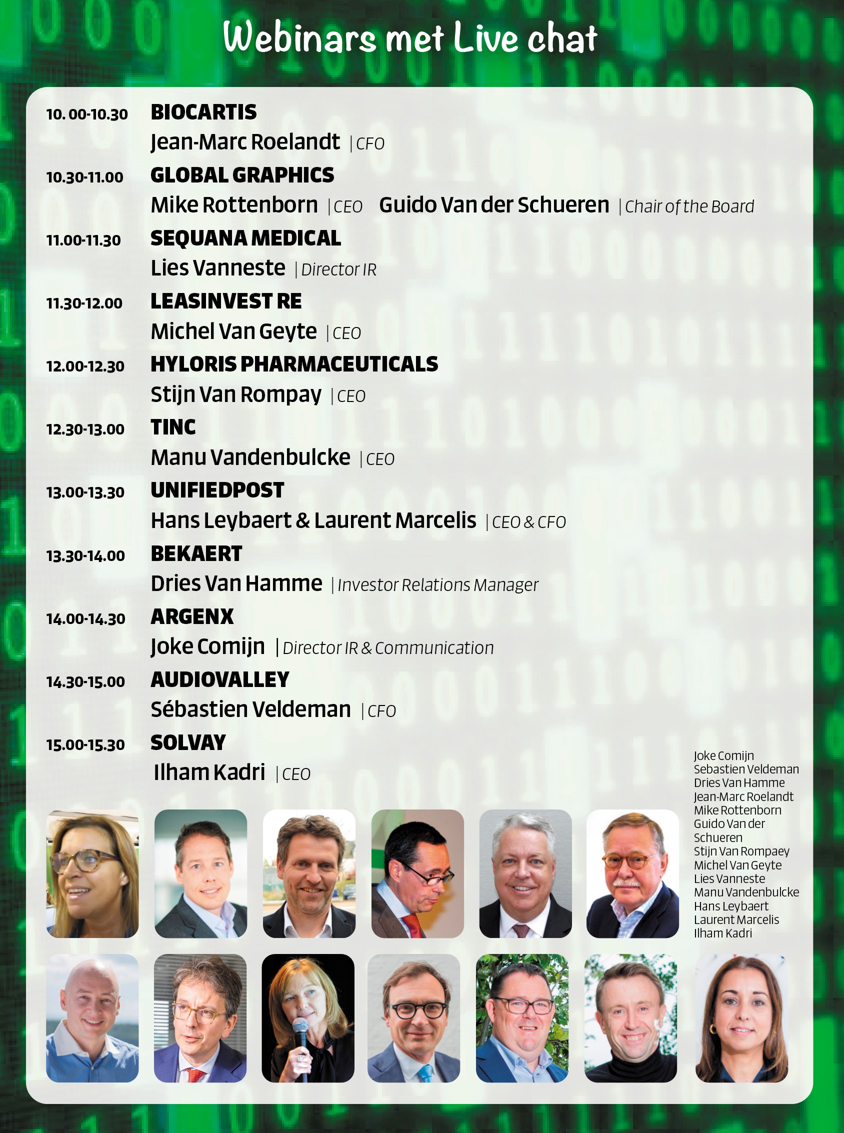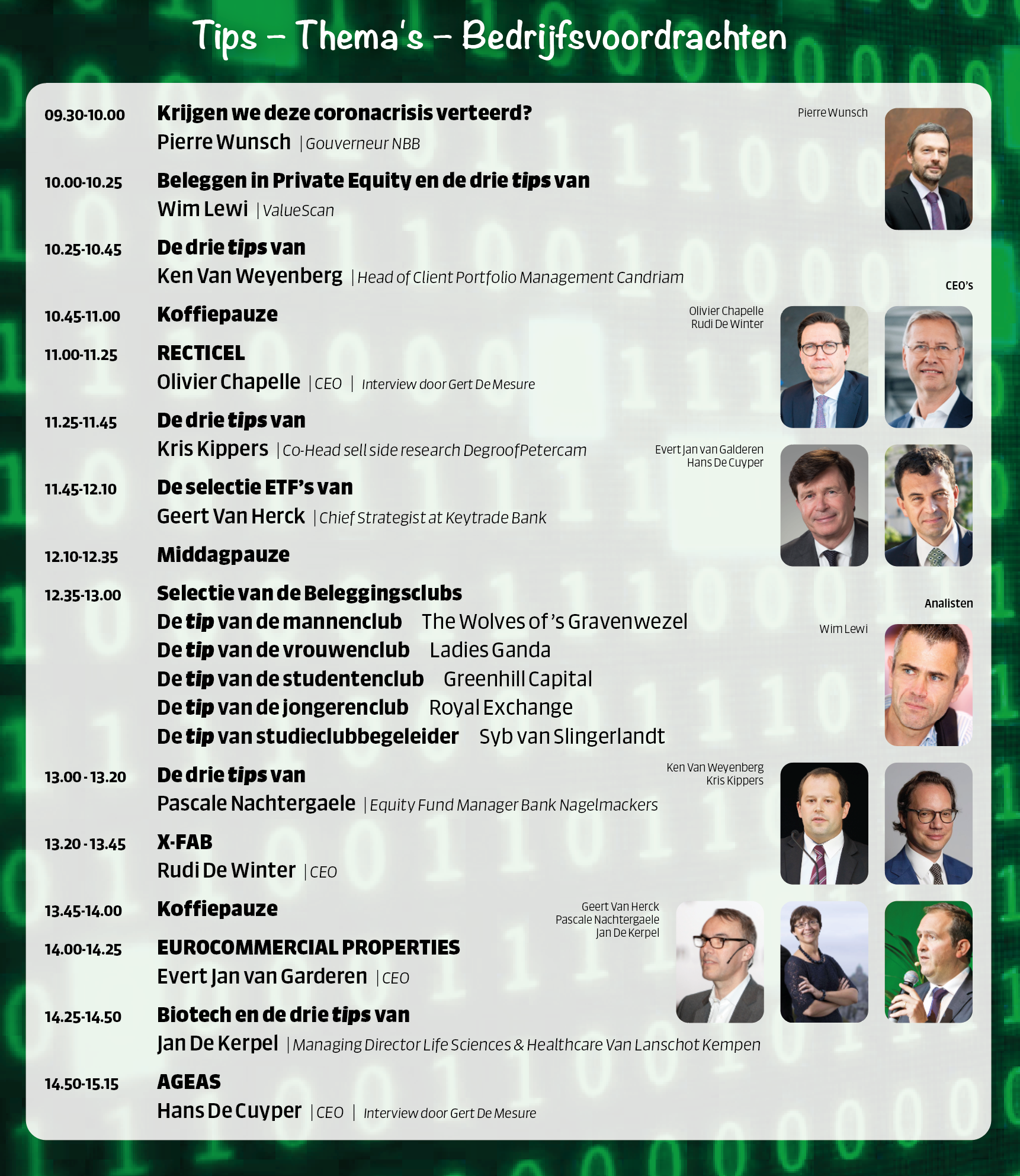 Het programma begint om 9u30 met een presentatie van Pierre Wunsch, Gouverneur NBB. Vanaf 10u00 kan u kiezen of u de 'Tips - Thema's - Bedrijfsvoordrachten' of de 'Webinars met Live chat' wenst te volgen.