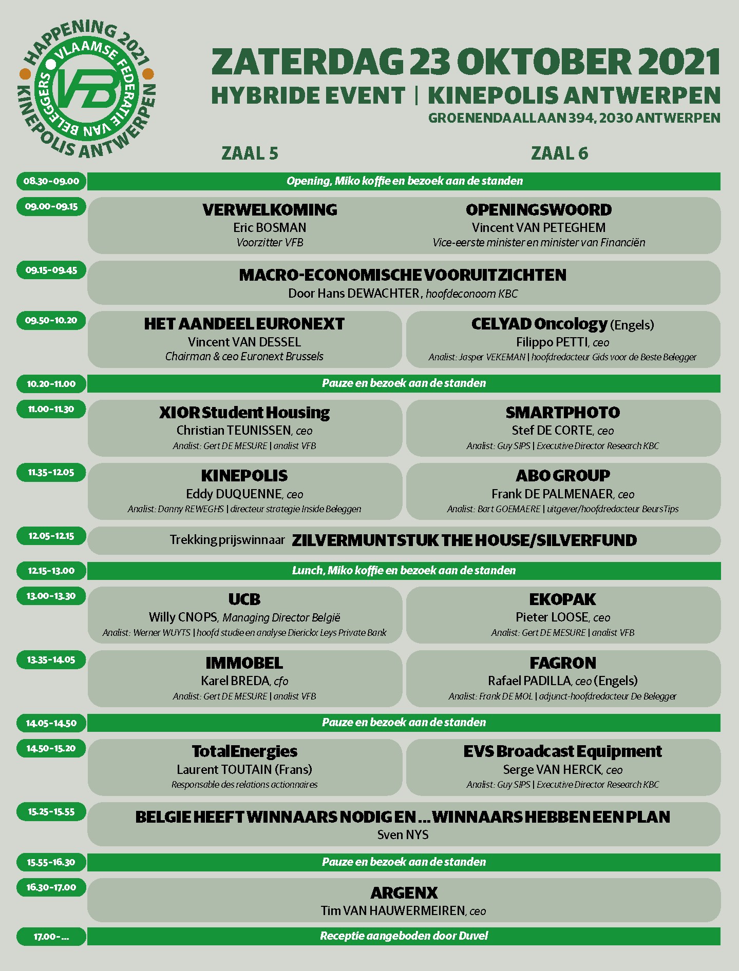 Het programma is zoals altijd van een hoog niveau, met vrijwel uitsluitend voordrachten door ceo’s. De presentaties van een rits biotech- en vastgoedaandelen zullen ook weer niet ontbreken. Deze zullen vooraf worden opgenomen en voorafgaand aan het congres ter beschikking worden gesteld. Zo kan je deze vooraf bekijken, je vragen voorbereiden en ze stellen aan de aanwezige standhouders.