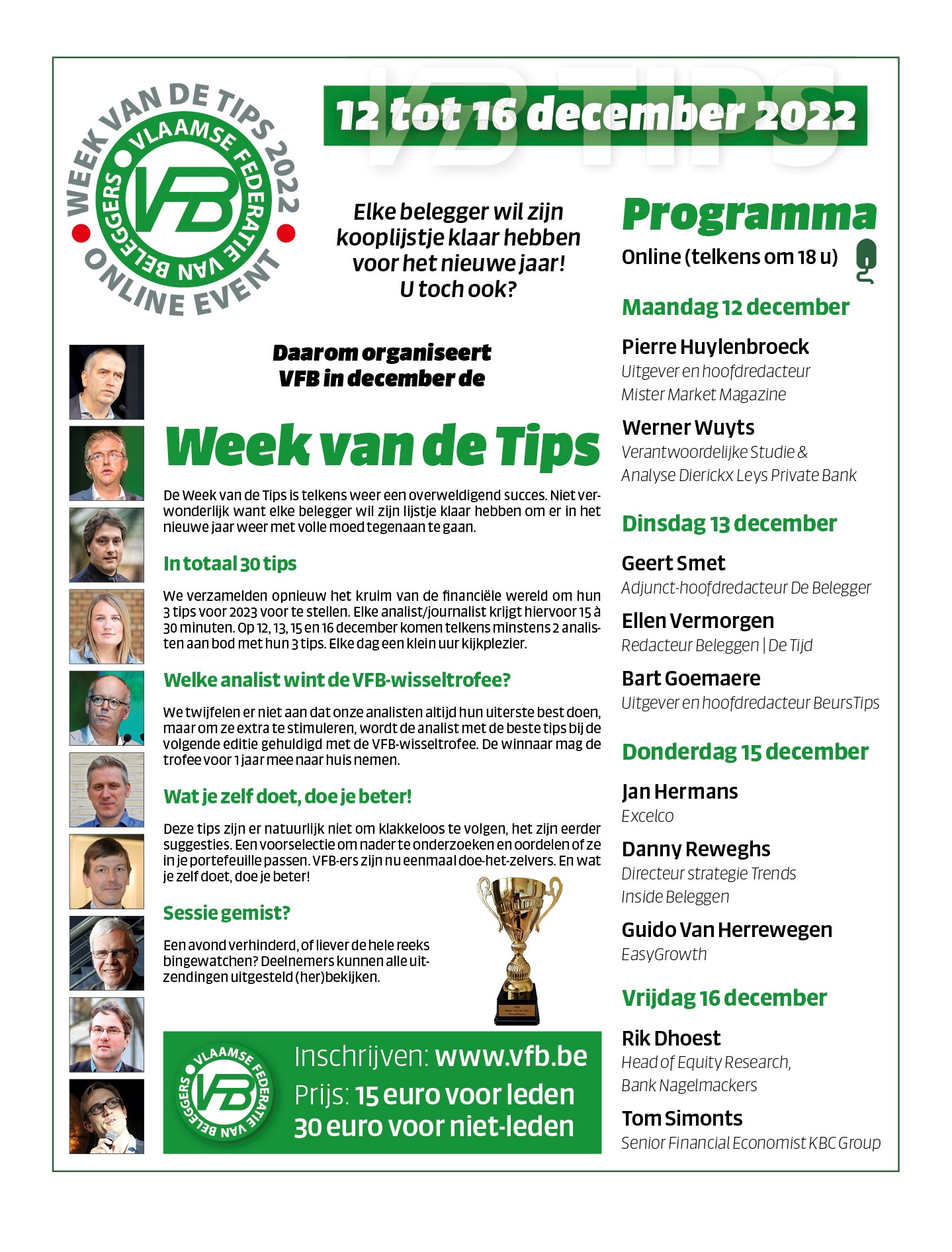 De analist met de beste tips mag bij de volgende editie de VFB-wisseltrofee mee naar huis nemen. De winnaar mag de trofee voor 1 jaar mee naar huis nemen. Wie bracht vorig jaar de beste tips en mag dit jaar de beker in ontvangst nemen van Bart Goemaere, de winnaar van vorig jaar. Of mag hij de beker nog een jaar in zijn kast laten staan?