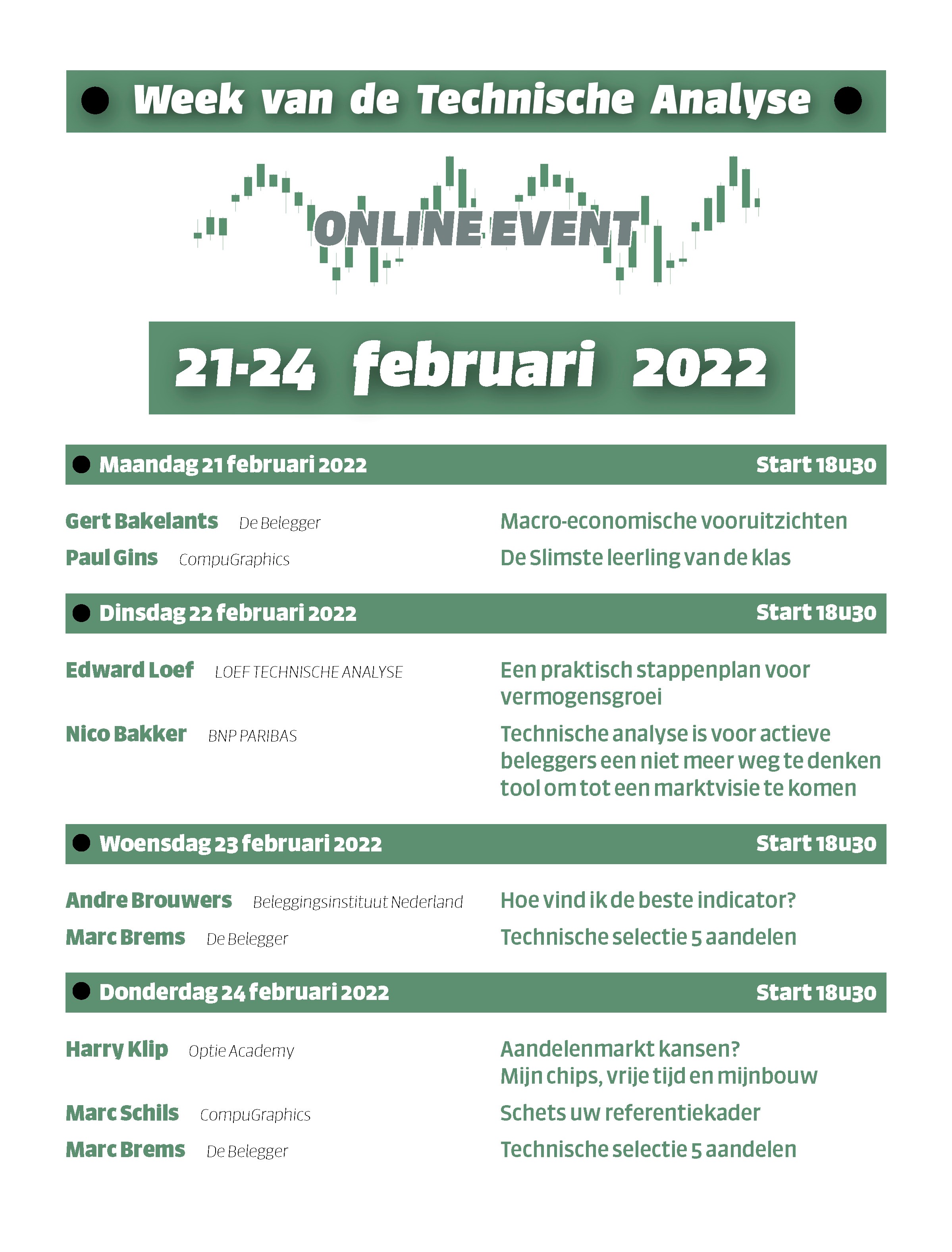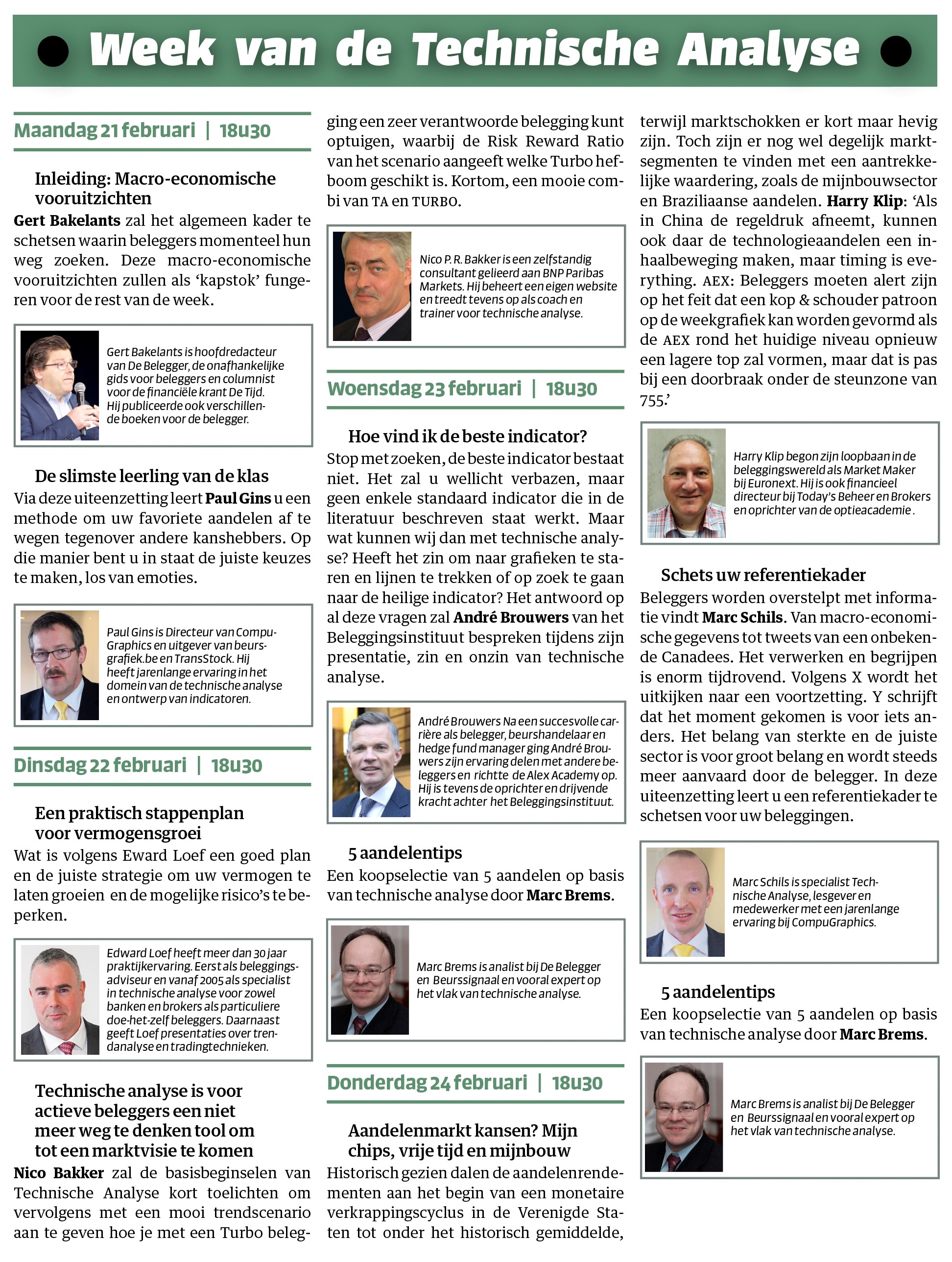 Maar hoe kan je met technische analyse nu een betere belegger worden? Zes technische analisten die tot de top van de lage landen behoren, brengen hun inzichten in technische analyse en zullen aantonen hoe je met technische analyse, los van emoties, de juiste keuzes kan maken en hoe je de risico’s verbonden aan beleggen, kan beperken. Bestaat er hiertoe iets als de ‘beste’ indicator? Hoe kan je met technische analyse een referentiekader schetsen en de toevloed aan informatie stroomlijnen? Een week waarin niet alleen de technische adepten hun gading zullen vinden, want voor beginnende technische analisten is er ook een toelichting bij de basisbeginselen.