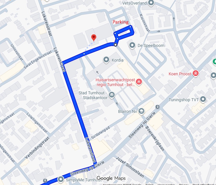 - Gratis parking – let op: inrijden via de Lokerenstraat en hierna de 3e straat rechts nemen (voor de gebouwen van Thomas More). Achteraan de straat bevindt zich de parking.